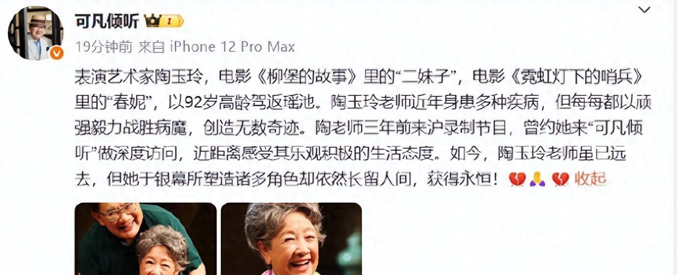 刚看到消息,心里哆嗦了一下。陶玉玲走了,92岁,走得挺安静。据说消息最先是冯远征在微博发出来的,跟着曹可凡也证实了——这不是坊间传闻,确实是真的。看到这个消息,说不郁闷是假的。那个《柳堡的故事》里的二妹子,《霓虹灯下的哨兵》里的春妮,那些经典画面飘到眼前,像老胶片一样慢慢转起来。